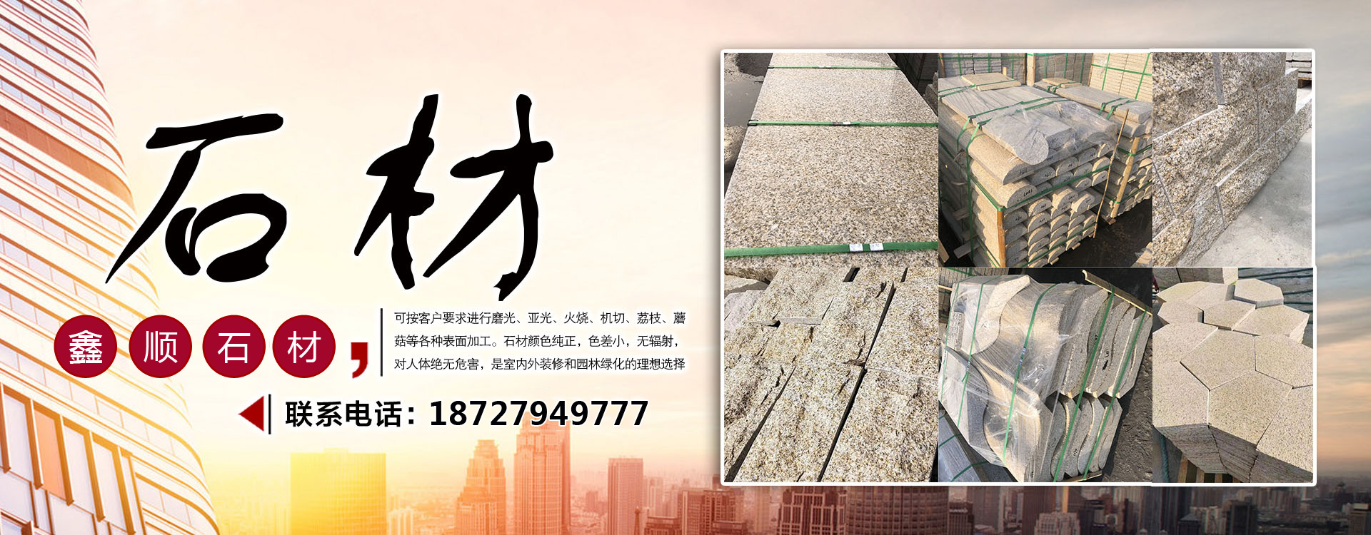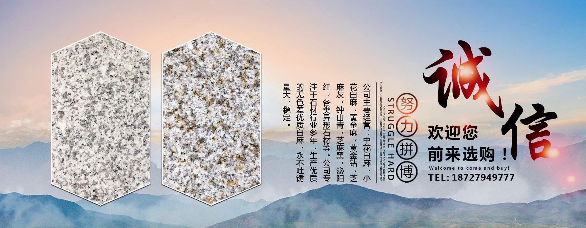 隨州市鑫順石材有限公司位于湖北省隨州市隨縣萬(wàn)和鎮(zhèn)桐柏山。是一家集礦山開(kāi)采、石材加工、異形制作、產(chǎn)品銷(xiāo)售為一體的大型綜合型石材企業(yè)!本公司主要經(jīng)營(yíng):中花白麻,小花白麻,黃金麻,黃金鉆,芝麻灰,鐘山青,芝麻黑,泌陽(yáng)紅,各類(lèi)異形石材。生產(chǎn)的石材規(guī)格齊全、做工精細(xì),被廣泛用于外墻干掛、廣場(chǎng)地鋪、市政園林、建筑工程、環(huán)境景觀異形石材等各類(lèi)建筑墻體、地面的裝飾裝修。公司專注于石材行業(yè)多年,生產(chǎn)優(yōu)質(zhì)的無(wú)色差優(yōu)質(zhì)白麻,永不吐銹量大,穩(wěn)定,主攻高鐵站,地鐵站,機(jī)場(chǎng)等大型市政房產(chǎn)。可承接各種異形加工,速度快,質(zhì)量無(wú)憂。我們秉承“誠(chéng)信經(jīng)營(yíng),服務(wù)為本”的經(jīng)營(yíng)理念,竭誠(chéng)為廣大客戶提供優(yōu)質(zhì)的產(chǎn)品和滿意服務(wù),期待與您的合作,竭誠(chéng)歡迎國(guó)內(nèi)外新老客戶前來(lái)訂購(gòu)洽談!